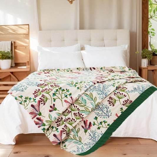 Floral Boho Throw Blanket – 100% Cotton, Ultra-Soft Breathable Quilt for Sofa & Bed, Green/Blue Design