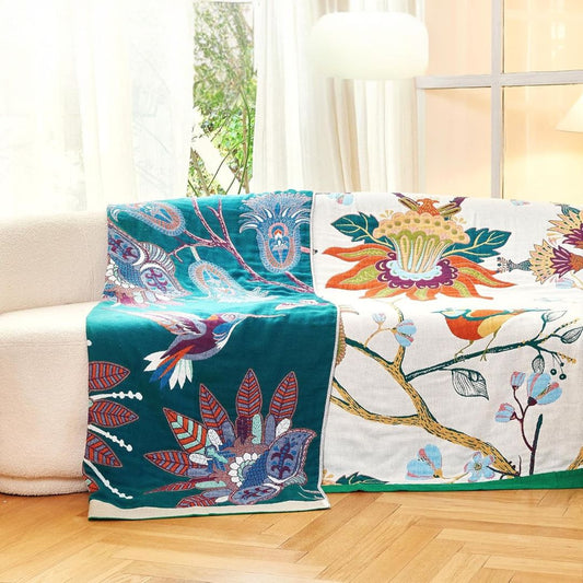 Boho Cotton Throw Blanket – Reversible Nordic Bird Floral Farmhouse Quilt in Teal/Beige